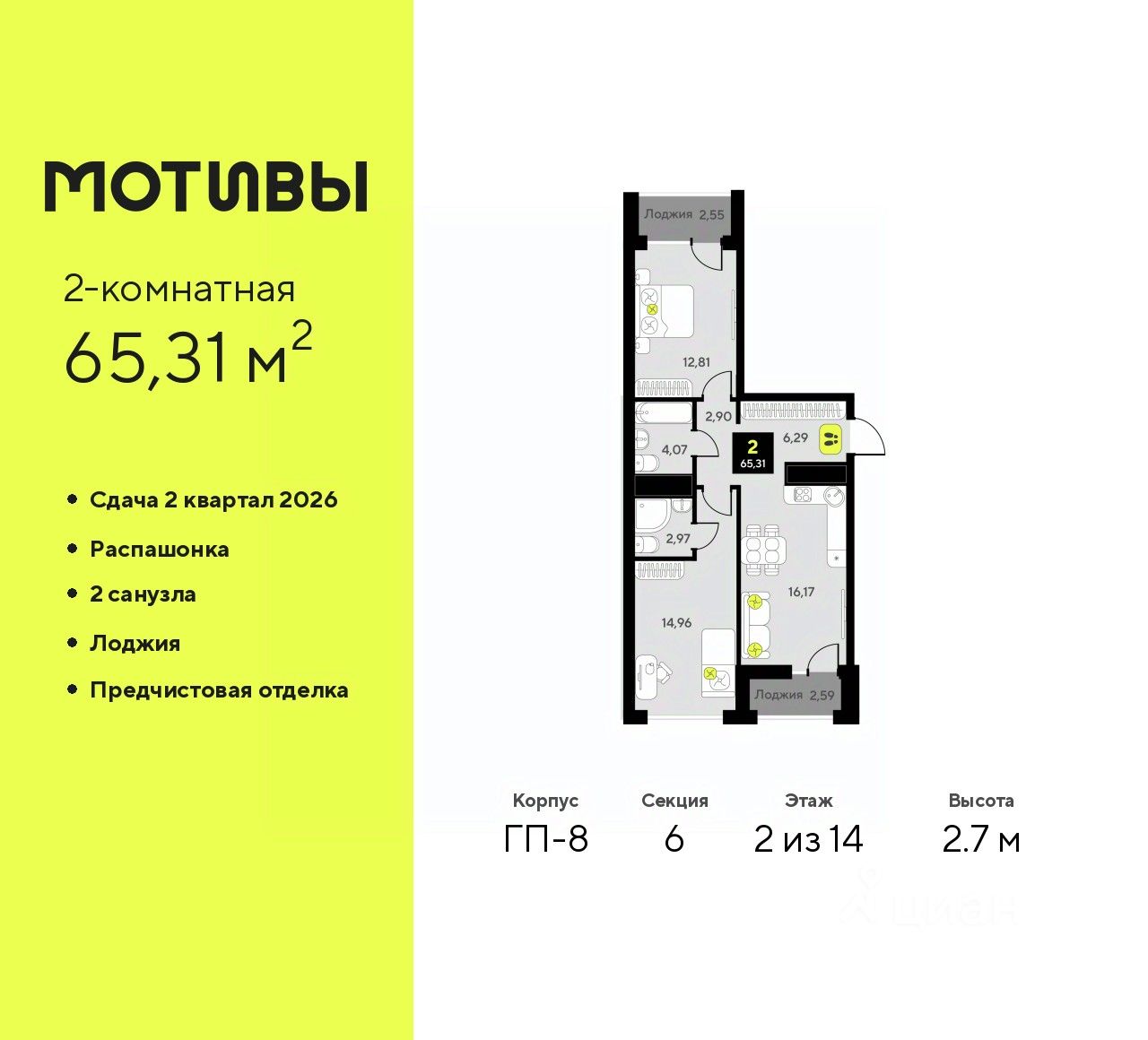 Двухкомнатная квартира от застройщика с предчистовой отделкой в ЖК "Мотивы" на 2 этаже. Общая площадь: 65.31 кв.м., жилая: 27.77 кв.м., площадь просторной кухни-столовой: 16.17 кв.м. Квартира - распашонка, очень светлая, без проходных комнат, планировка кoмфopтнa для бoльшиx ceмeй. В квартире две лоджии, два совмещенных санузла. Высота потолков 2.7 м.