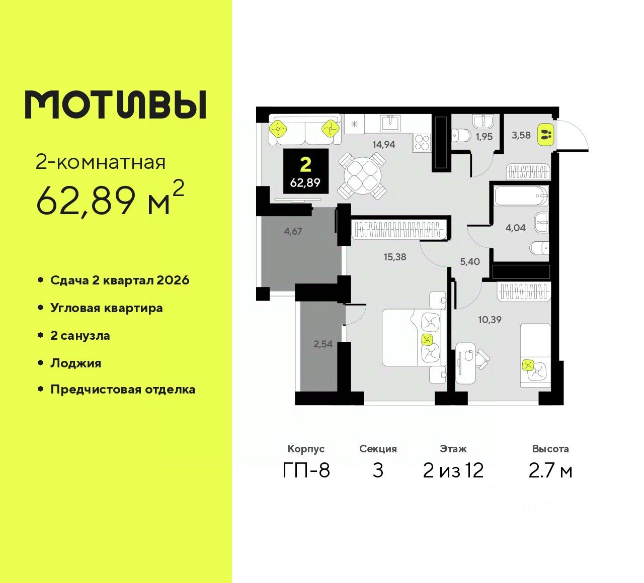 Двухкомнатная квартира от застройщика с предчистовой отделкой в ЖК "Мотивы" на 2 этаже. Общая площадь: 62.89 кв.м., жилая: 25.77 кв.м., площадь просторной кухни-столовой: 14.94 кв.м. Угловая квартира, идеально подойдет любителям тишины и панорамных видов. В квартире две лоджии, один совмещенный и один раздельный санузел. Высота потолков 2.7 м.