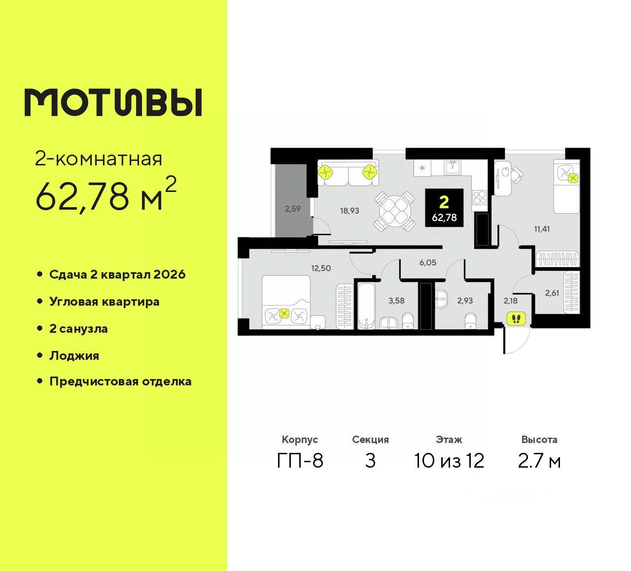 Продается двухкомнатная квартира с предчистовой отделкой в ЖК "Мотивы" на 10 этаже. Общая площадь: 62.78 кв.м., жилая: 23.91 кв.м., площадь просторной кухни-столовой: 18.93 кв.м. Квартира угловая, очень светлая, естественная вентиляция при открытии окон. В квартире одна лоджия, один совмещенный и один раздельный санузел. Высота потолков 2.7 м.