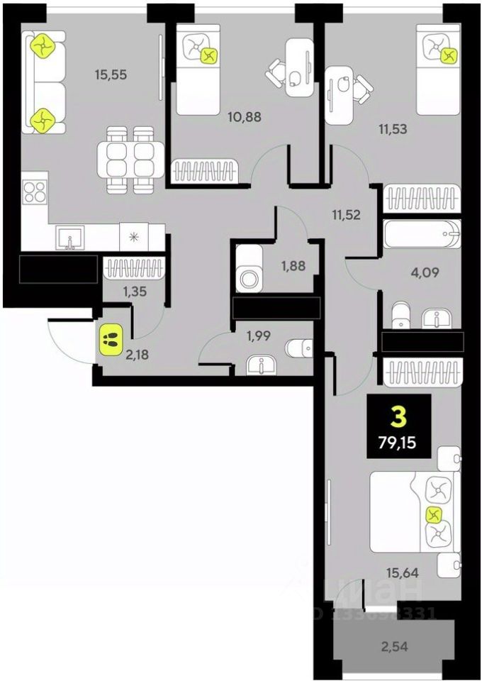 Продается 3-комн. квартира с предчистовой отделкой в ЖК "Мотивы" на 6 этаже. Общая площадь: 79.15 кв.м., жилая: 38.05 кв.м., площадь просторной кухни-столовой: 15.55 кв.м. Квартира - распашонка, без проходных комнат, окна выходят на paзные стороны дома. В квартире одна лоджия, один совмещенный и один раздельный санузел. Высота потолков 2.7 м.