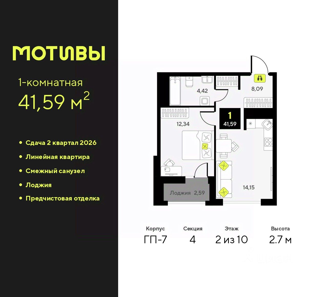 Продается 1-комн. квартира от застройщика с предчистовой отделкой в ЖК "Мотивы" на 2 этаже. Общая площадь: 41.59 кв.м., жилая: 12.34 кв.м., площадь просторной кухни-столовой: 14.15 кв.м. Все окна выходят на одну сторону. В квартире одна лоджия, один совмещенный санузел. Высота потолков 2.7 м.
