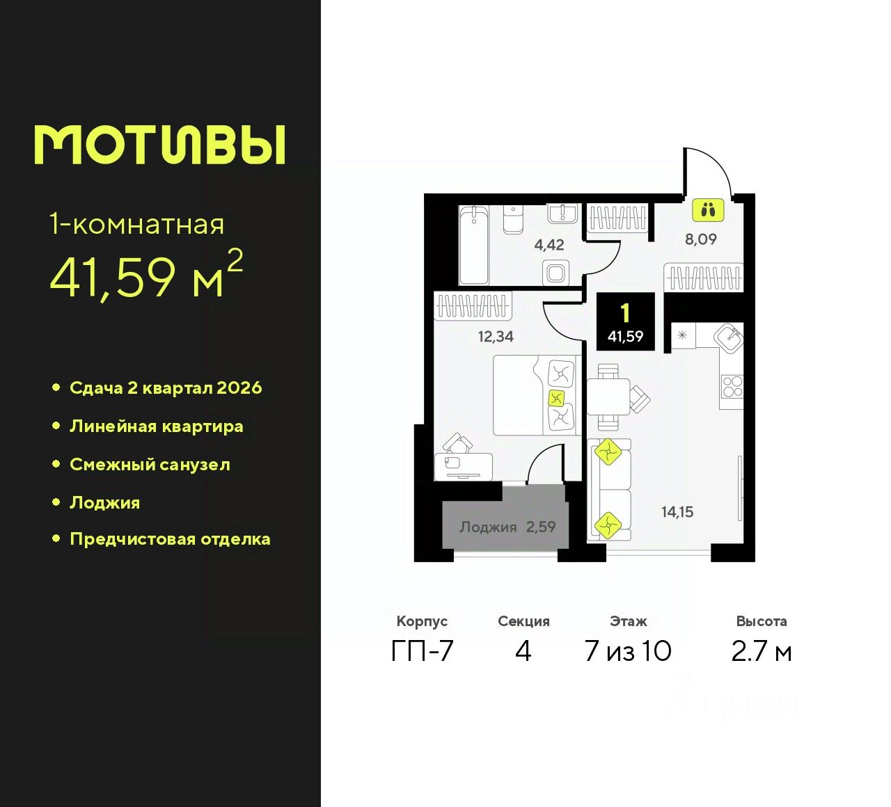 Просторная 1-комн. квартира с предчистовой отделкой в ЖК "Мотивы" на 7 этаже. Общая площадь: 41.59 кв.м., жилая: 12.34 кв.м., площадь просторной кухни-столовой: 14.15 кв.м. Все окна выходят на одну сторону. В квартире одна лоджия, один совмещенный санузел. Высота потолков 2.7 м.
