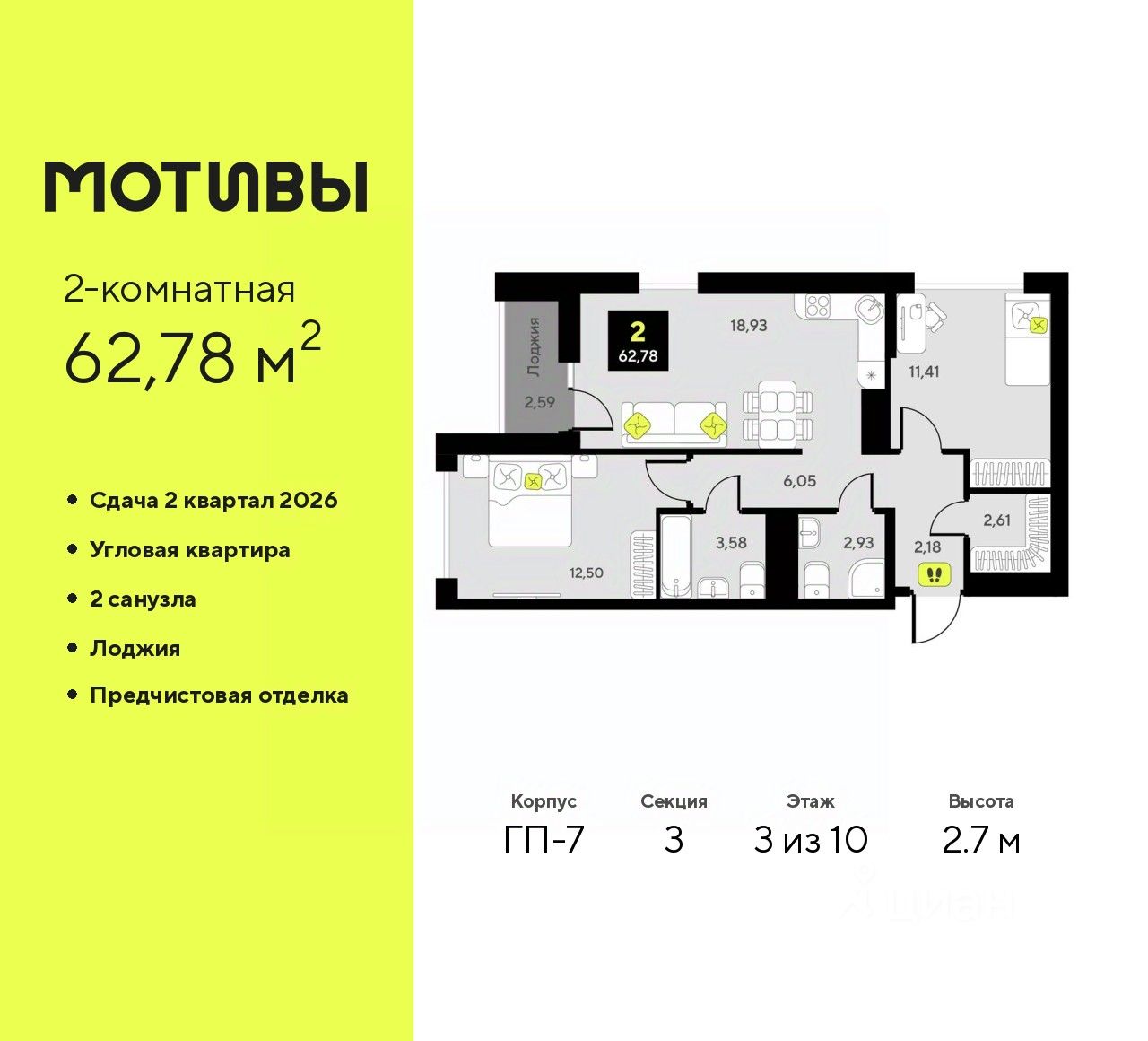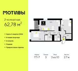 Продается 2-комн. квартира с предчистовой отделкой в ЖК "Мотивы" на 3 этаже. Общая площадь: 62.78 кв.м., жилая: 23.91 кв.м., площадь просторной кухни-столовой: 18.93 кв.м. Квартира угловая, идеально подойдет любителям тишины и панорамных видов. В квартире одна лоджия, два совмещенных санузла. Высота потолков 2.7 м.