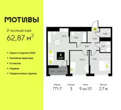 2-комн. квартира с предчистовой отделкой в ЖК "Мотивы" на 9 этаже. Общая площадь: 62.87 кв.м., жилая: 22.16 кв.м., площадь просторной кухни-столовой: 18.73 кв.м. Комнаты изолированные, все окна выходят на одну сторону. В квартире одна лоджия, два совмещенных санузла. Высота потолков 2.7 м.