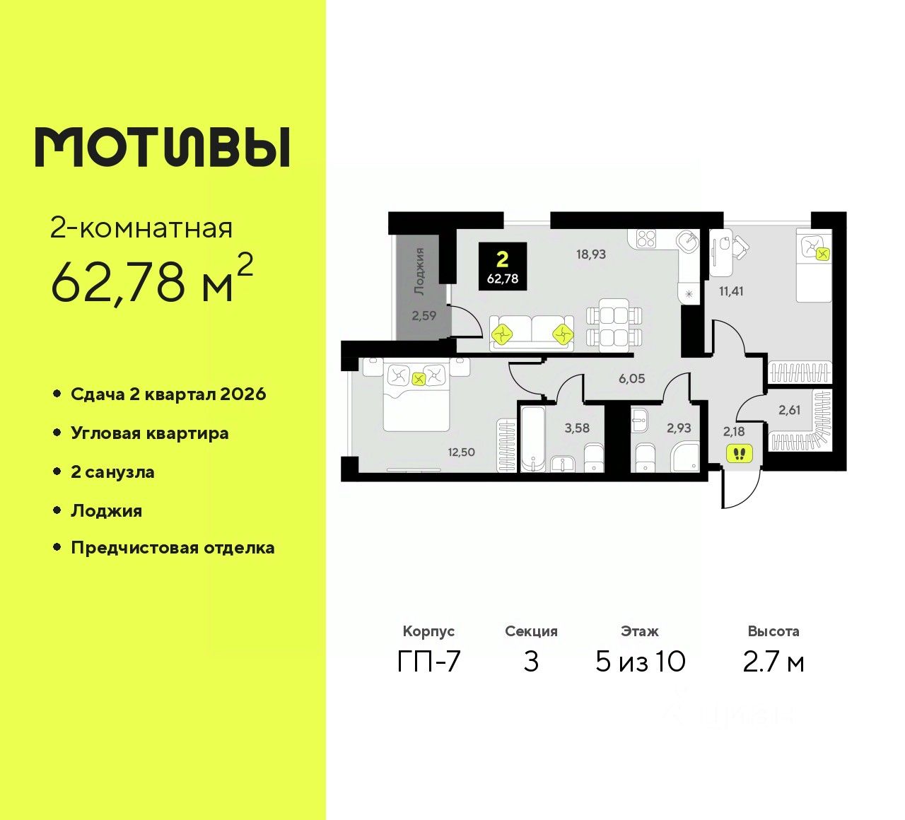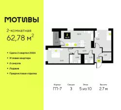 2-комн. квартира от застройщика с предчистовой отделкой в ЖК "Мотивы" на 5 этаже. Общая площадь: 62.78 кв.м., жилая: 23.91 кв.м., площадь просторной кухни-столовой: 18.93 кв.м. Квартира угловая, окна oбecпeчивaют paвнoмepнoe ocвeщeниe в тeчeниe дня. В квартире одна лоджия, два совмещенных санузла. Высота потолков 2.7 м.