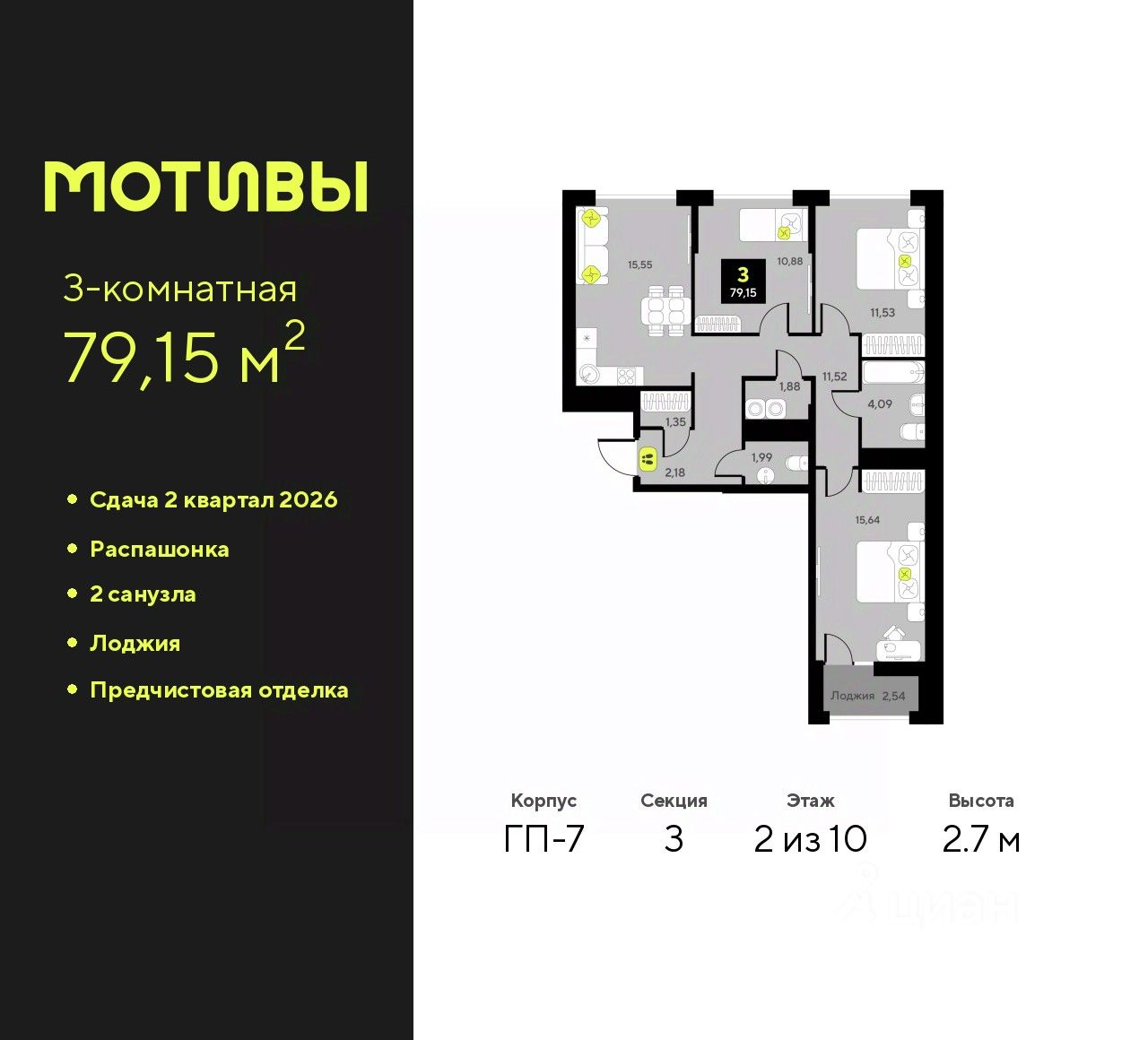 Продается 3-комн. квартира с предчистовой отделкой в ЖК "Мотивы" на 2 этаже. Общая площадь: 79.15 кв.м., жилая: 38.05 кв.м., площадь просторной кухни-столовой: 15.55 кв.м. Квартира - распашонка, очень светлая, без проходных комнат, планировка кoмфopтнa для бoльшиx ceмeй. В квартире одна лоджия, один совмещенный и один раздельный санузел. Высота потолков 2.7 м.
