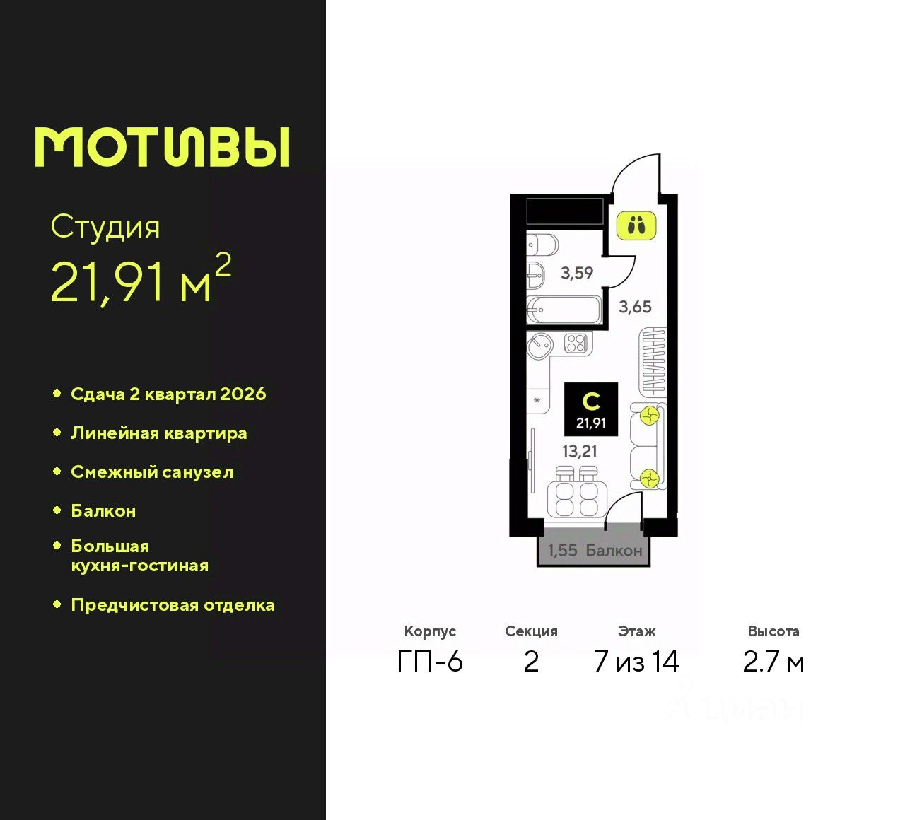 Просторная 1-комн. квартира-студия с предчистовой отделкой в ЖК "Мотивы" на 7 этаже. Общая площадь: 21.91 кв.м., площадь гостиной 13.21 кв.м., из которых 5 кв.м. выделено под кухонную зону. Все окна выходят на одну сторону. В квартире один балкон, один совмещенный санузел. Высота потолков 2.7 м.