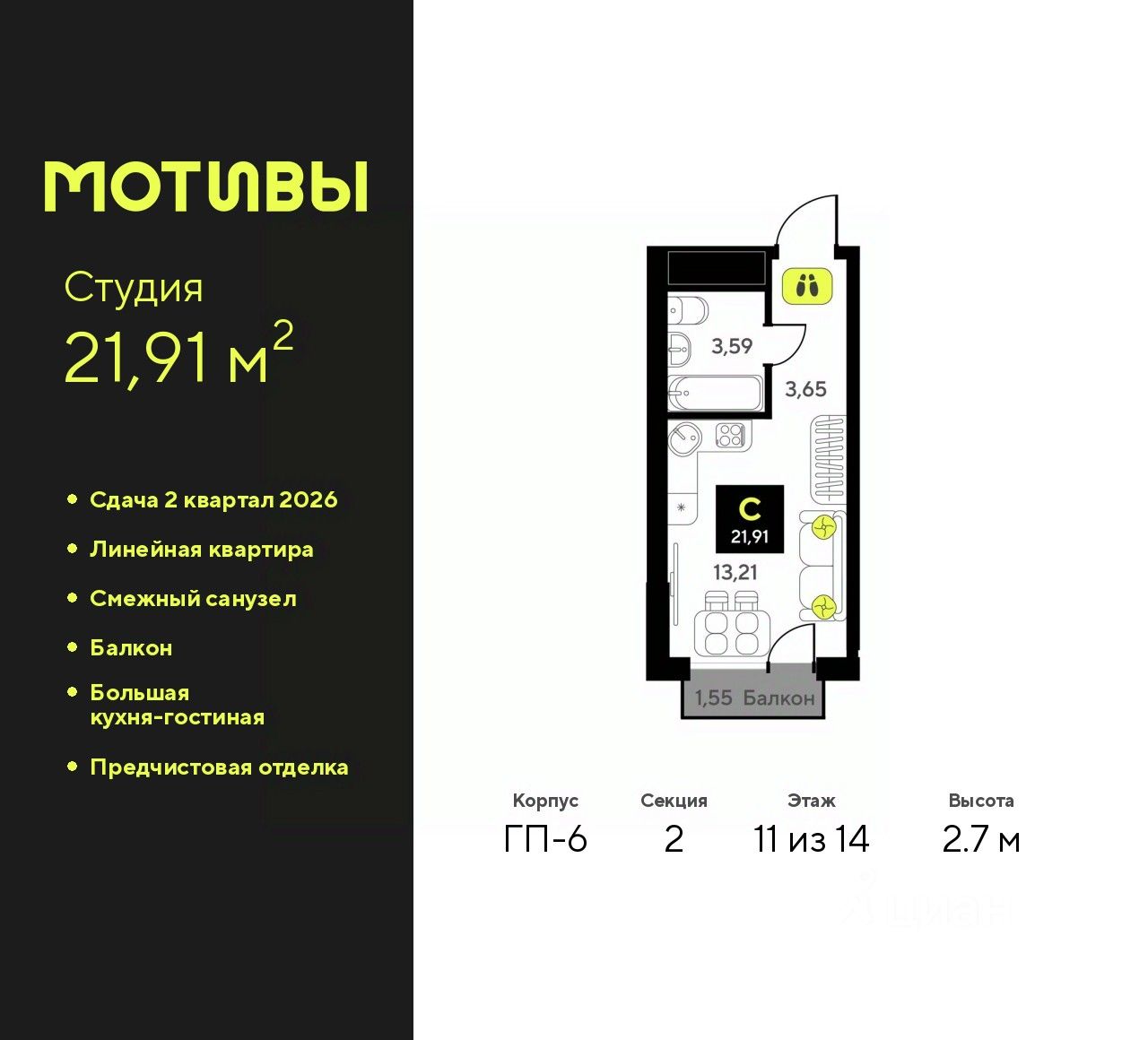 1-комн. квартира-студия от застройщика с предчистовой отделкой в ЖК "Мотивы" на 11 этаже. Общая площадь: 21.91 кв.м., площадь гостиной 13.21 кв.м., из которых 5 кв.м. выделено под кухонную зону. Все окна выходят на одну сторону. В квартире один балкон, один совмещенный санузел. Высота потолков 2.7 м.