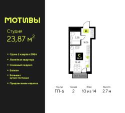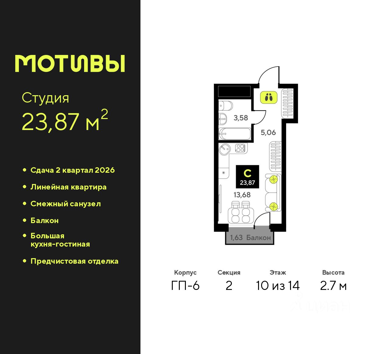 Просторная 1-комн. квартира-студия с предчистовой отделкой в ЖК "Мотивы" на 10 этаже. Общая площадь: 23.87 кв.м., площадь гостиной 13.68 кв.м., из которых 5 кв.м. выделено под кухонную зону. Все окна выходят на одну сторону. В квартире один балкон, один совмещенный санузел. Высота потолков 2.7 м.