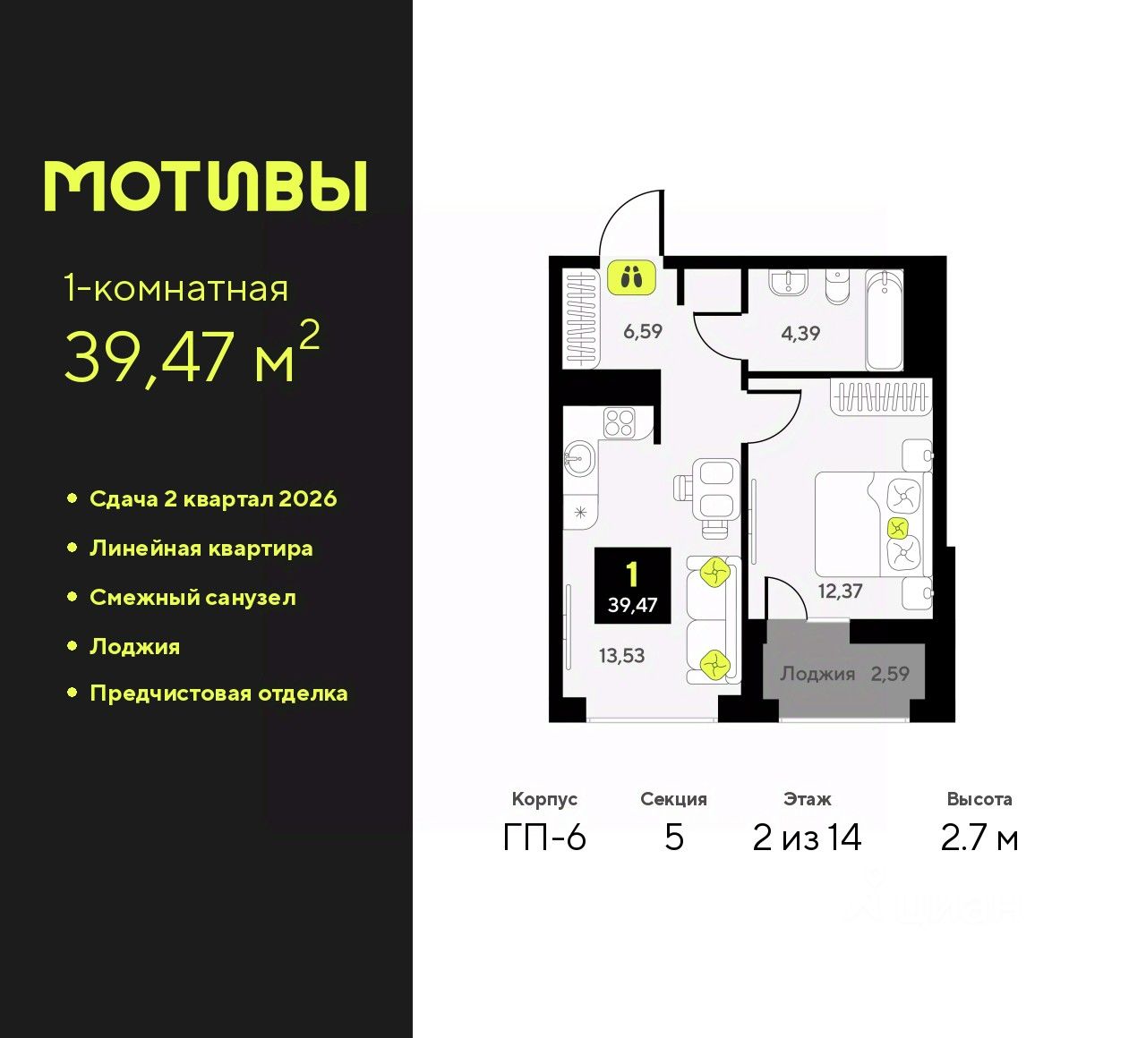 Просторная 1-комн. квартира с предчистовой отделкой в ЖК "Мотивы" на 2 этаже. Общая площадь: 39.47 кв.м., жилая: 12.37 кв.м., площадь просторной кухни-столовой: 13.53 кв.м. Все окна выходят на одну сторону. В квартире одна лоджия, один совмещенный санузел. Высота потолков 2.7 м.