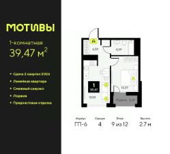Однокомнатная квартира с предчистовой отделкой в ЖК "Мотивы" на 9 этаже. Общая площадь: 39.47 кв.м., жилая: 12.37 кв.м., площадь просторной кухни-столовой: 13.53 кв.м. Все окна выходят на одну сторону. В квартире одна лоджия, один совмещенный санузел. Высота потолков 2.7 м.