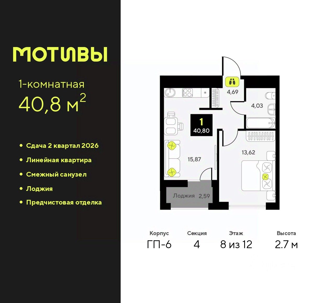 Продается однокомнатная квартира с предчистовой отделкой в ЖК "Мотивы" на 8 этаже. Общая площадь: 40.8 кв.м., жилая: 13.62 кв.м., площадь просторной кухни-столовой: 15.87 кв.м. Все окна выходят на одну сторону. В квартире одна лоджия, один совмещенный санузел. Высота потолков 2.7 м.