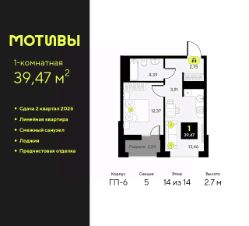 1-комн. квартира с предчистовой отделкой в ЖК "Мотивы" на 14 этаже. Общая площадь: 39.47 кв.м., жилая: 12.37 кв.м., площадь просторной кухни-столовой: 13.53 кв.м. Все окна выходят на одну сторону. В квартире одна лоджия, один совмещенный санузел. Высота потолков 2.7 м.