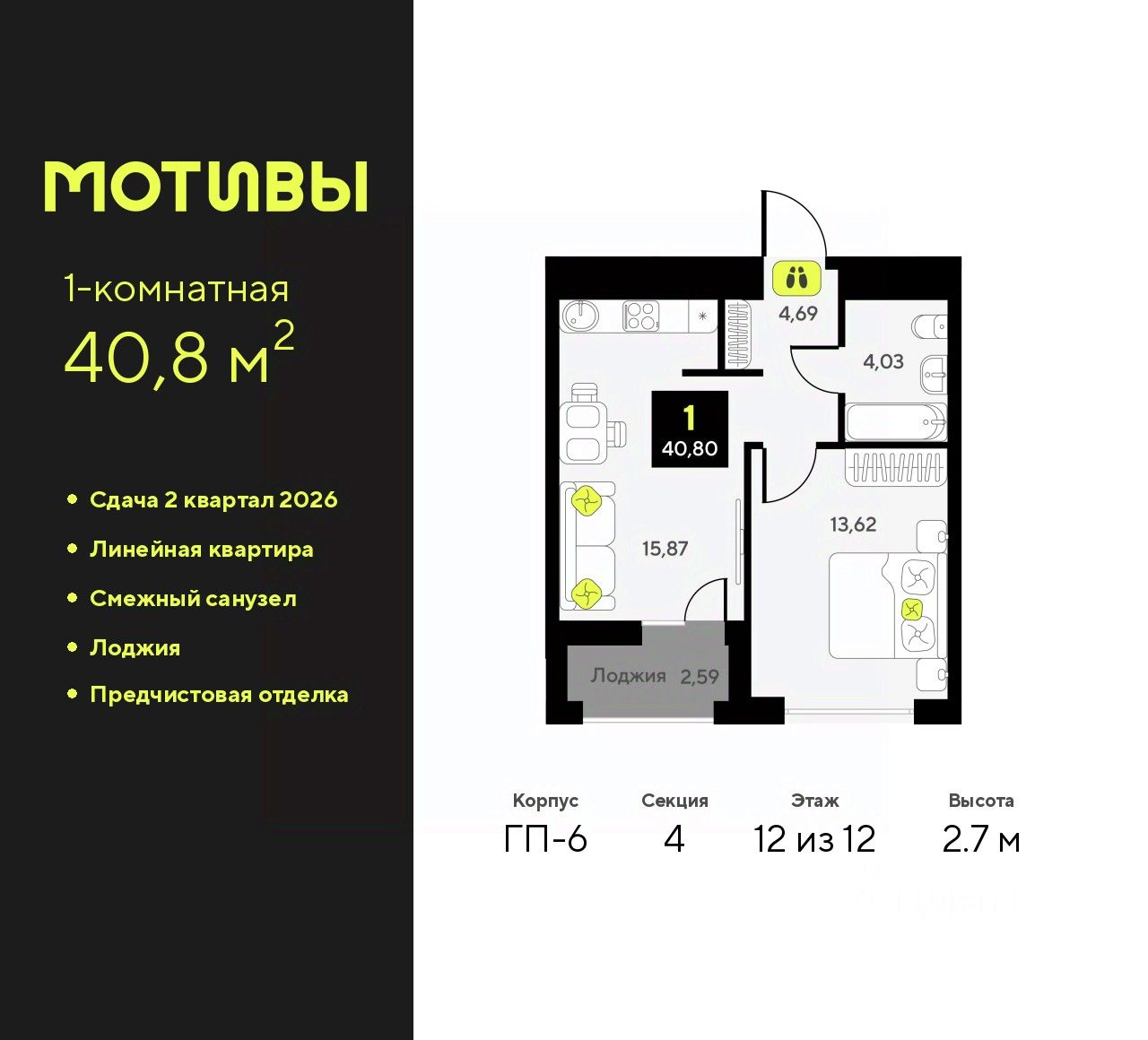 Просторная 1-комн. квартира с предчистовой отделкой в ЖК "Мотивы" на 12 этаже. Общая площадь: 40.8 кв.м., жилая: 13.62 кв.м., площадь просторной кухни-столовой: 15.87 кв.м. Все окна выходят на одну сторону. В квартире одна лоджия, один совмещенный санузел. Высота потолков 2.7 м.