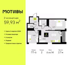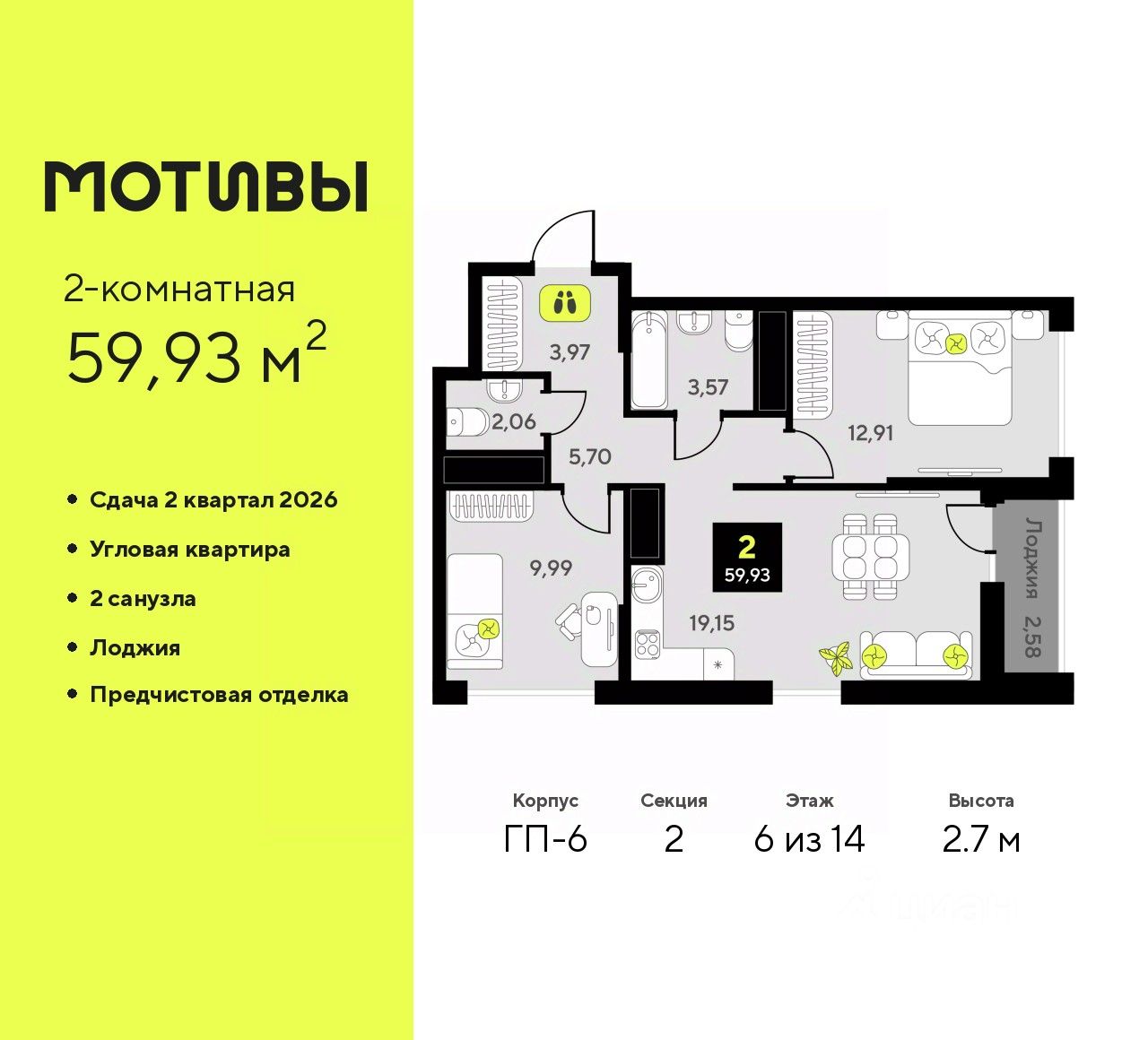 2-комн. квартира от застройщика с предчистовой отделкой в ЖК "Мотивы" на 6 этаже. Общая площадь: 59.93 кв.м., жилая: 22.9 кв.м., площадь просторной кухни-столовой: 19.15 кв.м. Угловая квартира, очень светлая, естественная вентиляция при открытии окон. В квартире одна лоджия, один совмещенный и один раздельный санузел. Высота потолков 2.7 м.