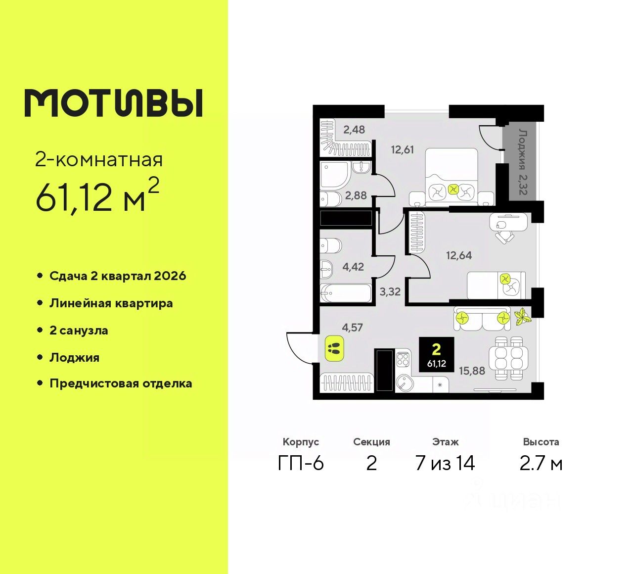 2-комн. квартира от застройщика с предчистовой отделкой в ЖК "Мотивы" на 7 этаже. Общая площадь: 61.12 кв.м., жилая: 25.25 кв.м., площадь просторной кухни-столовой: 15.88 кв.м. Комнаты изолированные, все окна выходят на одну сторону. В квартире одна лоджия, два совмещенных санузла. Высота потолков 2.7 м.