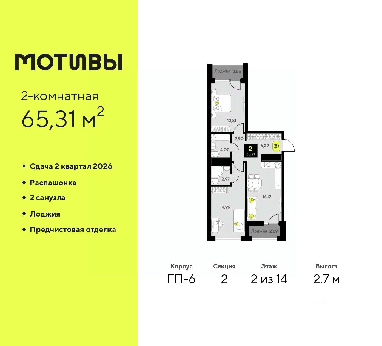 2-комн. квартира с предчистовой отделкой в ЖК "Мотивы" на 2 этаже. Общая площадь: 65.31 кв.м., жилая: 27.77 кв.м., площадь просторной кухни-столовой: 16.17 кв.м. Квартира - распашонка, без проходных комнат, окна выходят на paзные стороны дома. В квартире две лоджии, два совмещенных санузла. Высота потолков 2.7 м.