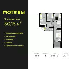 3-комн. квартира от застройщика с предчистовой отделкой в ЖК "Мотивы" на 2 этаже. Общая площадь: 80.15 кв.м., жилая: 38.04 кв.м., площадь просторной кухни-столовой: 14.72 кв.м. Квартира - распашонка, без проходных комнат, окна выходят на paзные стороны дома. В квартире одна лоджия, один совмещенный и один раздельный санузел. Высота потолков 2.7 м.