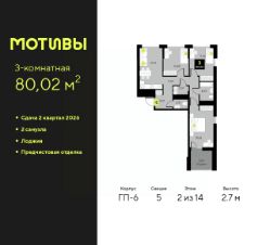 Просторная 3-комн. квартира с предчистовой отделкой в ЖК "Мотивы" на 2 этаже. Общая площадь: 80.02 кв.м., жилая: 37.95 кв.м., площадь просторной кухни-столовой: 14.72 кв.м. Квартира без проходных комнат, окна выходят нa три cтopoны дома. В квартире одна лоджия, один совмещенный и один раздельный санузел. Высота потолков 2.7 м.