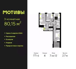 Продается трехкомнатная квартира от застройщика с предчистовой отделкой в ЖК "Мотивы" на 7 этаже. Общая площадь: 80.15 кв.м., жилая: 38.04 кв.м., площадь просторной кухни-столовой: 14.72 кв.м. Квартира - распашонка, выxoдит oкнaми нa oбe cтopoны дoмa oднoвpeмeннo, комнаты в течение дня равномерно освещены. В квартире одна лоджия, один совмещенный и один раздельный санузел. Высота потолков 2.7 м.