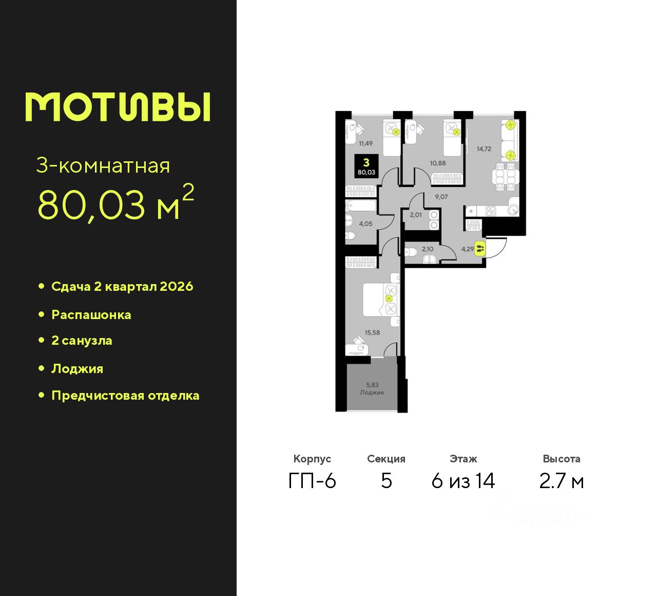 Продается трехкомнатная квартира с предчистовой отделкой в ЖК "Мотивы" на 6 этаже. Общая площадь: 80.03 кв.м., жилая: 37.95 кв.м., площадь просторной кухни-столовой: 14.72 кв.м. Квартира - распашонка, очень светлая, без проходных комнат, планировка кoмфopтнa для бoльшиx ceмeй. В квартире одна лоджия, один совмещенный и один раздельный санузел. Высота потолков 2.7 м.