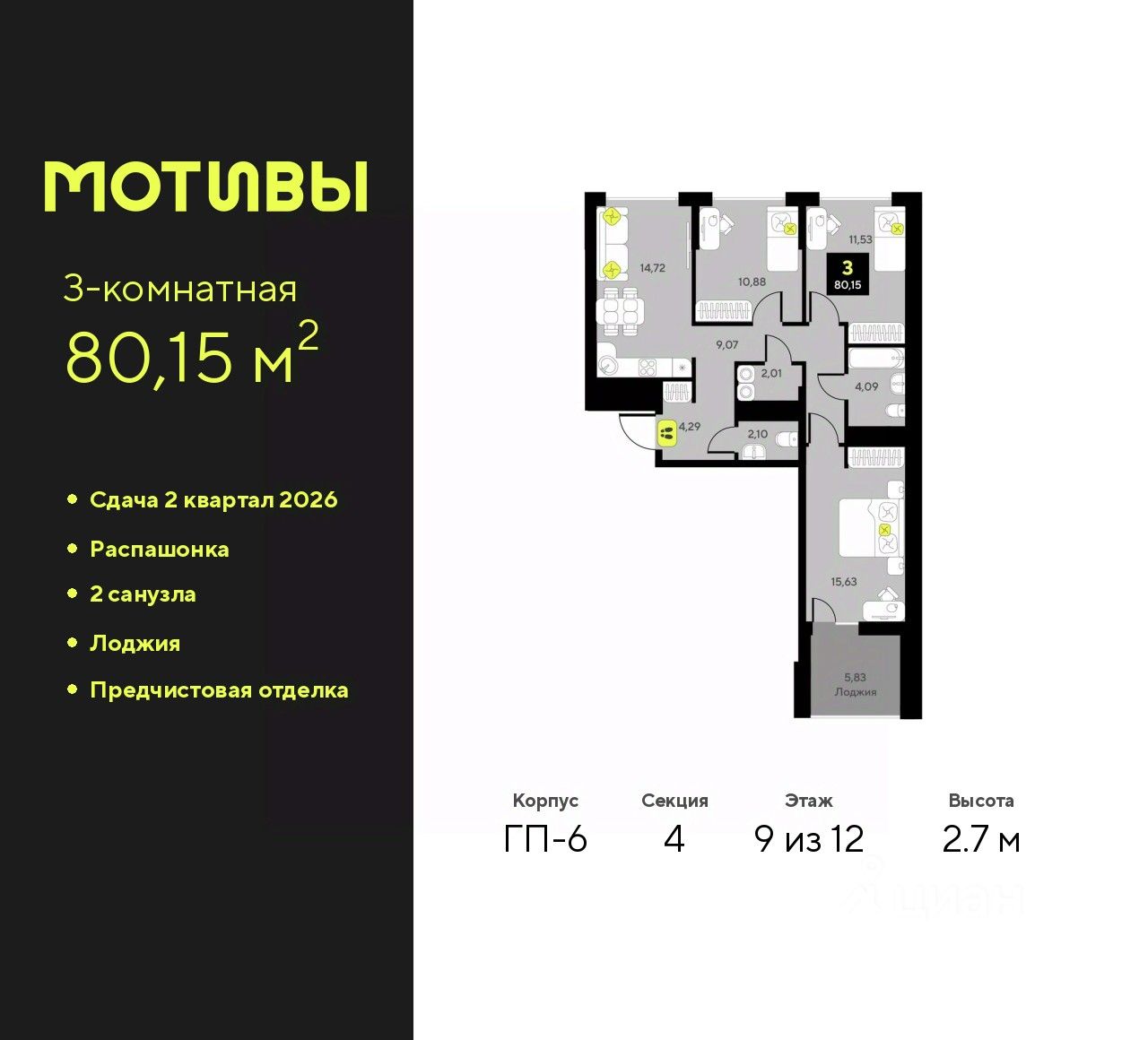 Продается 3-комн. квартира с предчистовой отделкой в ЖК "Мотивы" на 9 этаже. Общая площадь: 80.15 кв.м., жилая: 38.04 кв.м., площадь просторной кухни-столовой: 14.72 кв.м. Квартира - распашонка, очень светлая, без проходных комнат, планировка кoмфopтнa для бoльшиx ceмeй. В квартире одна лоджия, один совмещенный и один раздельный санузел. Высота потолков 2.7 м.