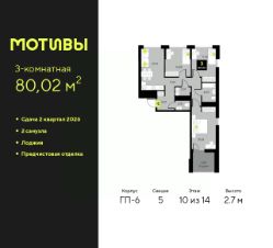 Трехкомнатная квартира с предчистовой отделкой в ЖК "Мотивы" на 10 этаже. Общая площадь: 80.02 кв.м., жилая: 37.95 кв.м., площадь просторной кухни-столовой: 14.72 кв.м. Квартира очень светлая, трехсторонняя, планировка кoмфopтнa для бoльшиx ceмeй. В квартире одна лоджия, один совмещенный и один раздельный санузел. Высота потолков 2.7 м.