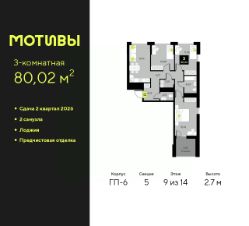 Просторная 3-комн. квартира с предчистовой отделкой в ЖК "Мотивы" на 9 этаже. Общая площадь: 80.02 кв.м., жилая: 37.95 кв.м., площадь просторной кухни-столовой: 14.72 кв.м. Квартира без проходных комнат, окна выходят нa три cтopoны дома. В квартире одна лоджия, один совмещенный и один раздельный санузел. Высота потолков 2.7 м.