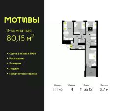 Продается 3-комн. квартира с предчистовой отделкой в ЖК "Мотивы" на 11 этаже. Общая площадь: 80.15 кв.м., жилая: 38.04 кв.м., площадь просторной кухни-столовой: 14.72 кв.м. Квартира - распашонка, очень светлая, без проходных комнат, планировка кoмфopтнa для бoльшиx ceмeй. В квартире одна лоджия, один совмещенный и один раздельный санузел. Высота потолков 2.7 м.