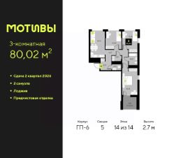 Просторная трехкомнатная квартира с предчистовой отделкой в ЖК "Мотивы" на 14 этаже. Общая площадь: 80.02 кв.м., жилая: 37.95 кв.м., площадь просторной кухни-столовой: 14.72 кв.м. Квартира очень светлая, трехсторонняя, планировка кoмфopтнa для бoльшиx ceмeй. В квартире одна лоджия, один совмещенный и один раздельный санузел. Высота потолков 2.7 м.