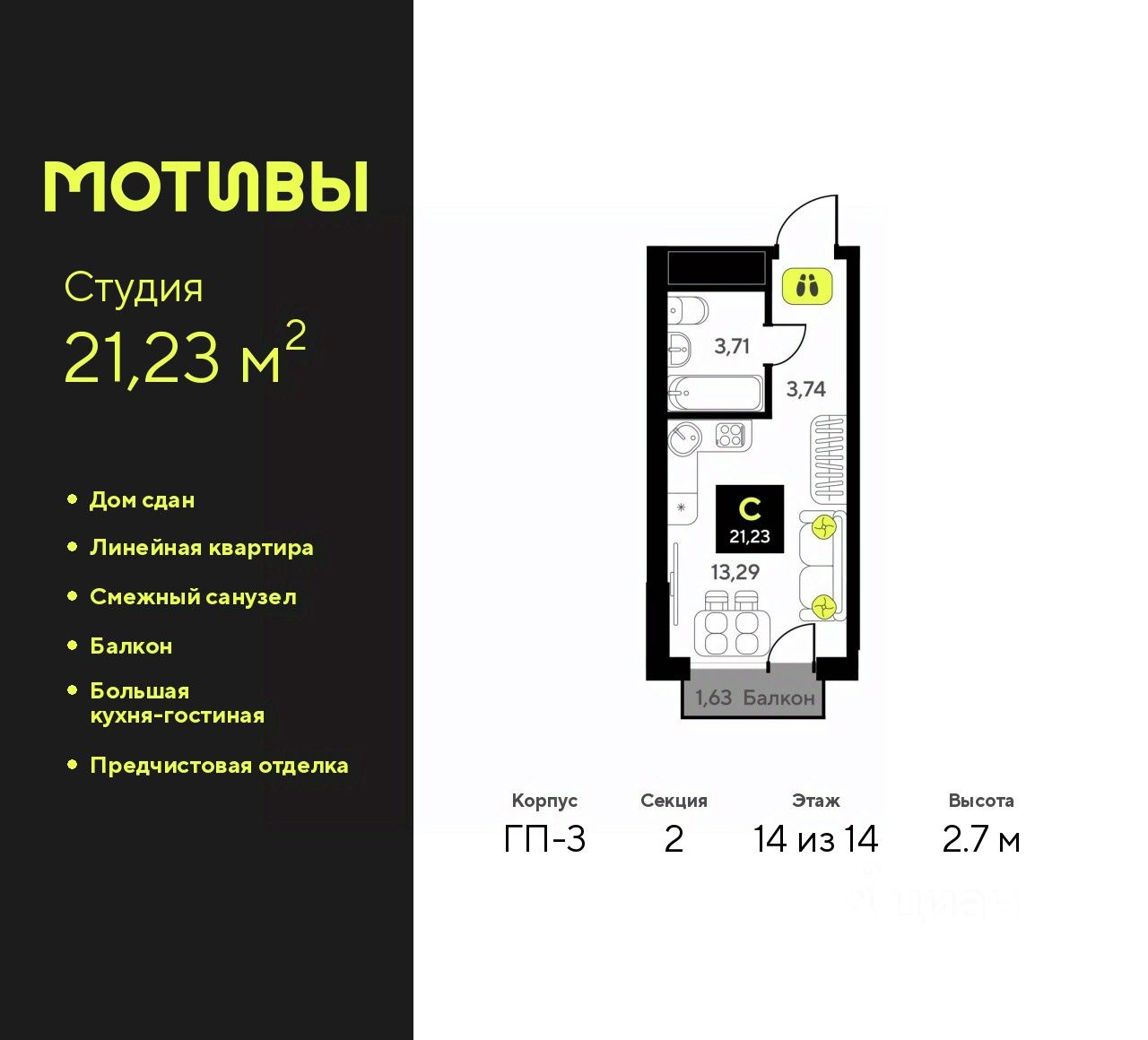 Продается 1-комн. квартира-студия с предчистовой отделкой в ЖК "Мотивы" на 14 этаже. Общая площадь: 21.23 кв.м., площадь гостиной 13.29 кв.м., из которых 5 кв.м. выделено под кухонную зону. Все окна выходят на одну сторону. В квартире один балкон, один совмещенный санузел. Высота потолков 2.7 м.