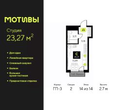 Однокомнатная квартира-студия с предчистовой отделкой в ЖК "Мотивы" на 14 этаже. Общая площадь: 23.27 кв.м., площадь гостиной 13.89 кв.м., из которых 5 кв.м. выделено под кухонную зону. Все окна выходят на одну сторону. В квартире один балкон, один совмещенный санузел. Высота потолков 2.7 м.