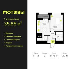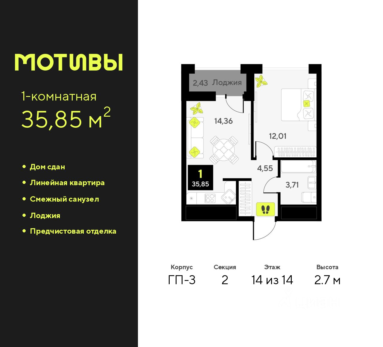1-комн. квартира с предчистовой отделкой в ЖК "Мотивы" на 14 этаже. Общая площадь: 35.85 кв.м., жилая: 12.01 кв.м., площадь просторной кухни-столовой: 14.36 кв.м. Все окна выходят на одну сторону. В квартире одна лоджия, один совмещенный санузел. Высота потолков 2.7 м.
