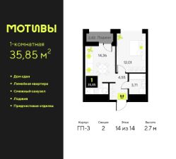 Однокомнатная квартира от застройщика с предчистовой отделкой в ЖК "Мотивы" на 14 этаже. Общая площадь: 35.85 кв.м., жилая: 12.01 кв.м., площадь просторной кухни-столовой: 14.36 кв.м. Все окна выходят на одну сторону. В квартире одна лоджия, один совмещенный санузел. Высота потолков 2.7 м.