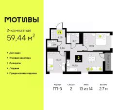 2-комн. квартира от застройщика с предчистовой отделкой в ЖК "Мотивы" на 13 этаже. Общая площадь: 59.44 кв.м., жилая: 23.19 кв.м., площадь просторной кухни-столовой: 19.33 кв.м. Угловая квартира, идеально подойдет любителям тишины и панорамных видов. В квартире одна лоджия, один совмещенный и один раздельный санузел. Высота потолков 2.7 м.