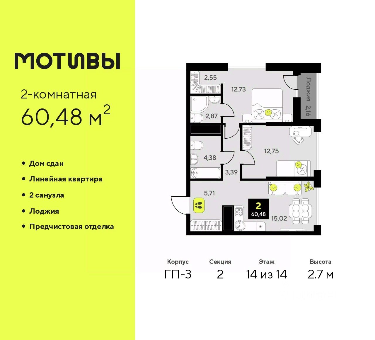 Продается двухкомнатная квартира от застройщика с предчистовой отделкой в ЖК "Мотивы" на 14 этаже. Общая площадь: 60.48 кв.м., жилая: 25.48 кв.м., площадь просторной кухни-столовой: 15.02 кв.м. Комнаты изолированные, все окна выходят на одну сторону. В квартире одна лоджия, два совмещенных санузла. Высота потолков 2.7 м.