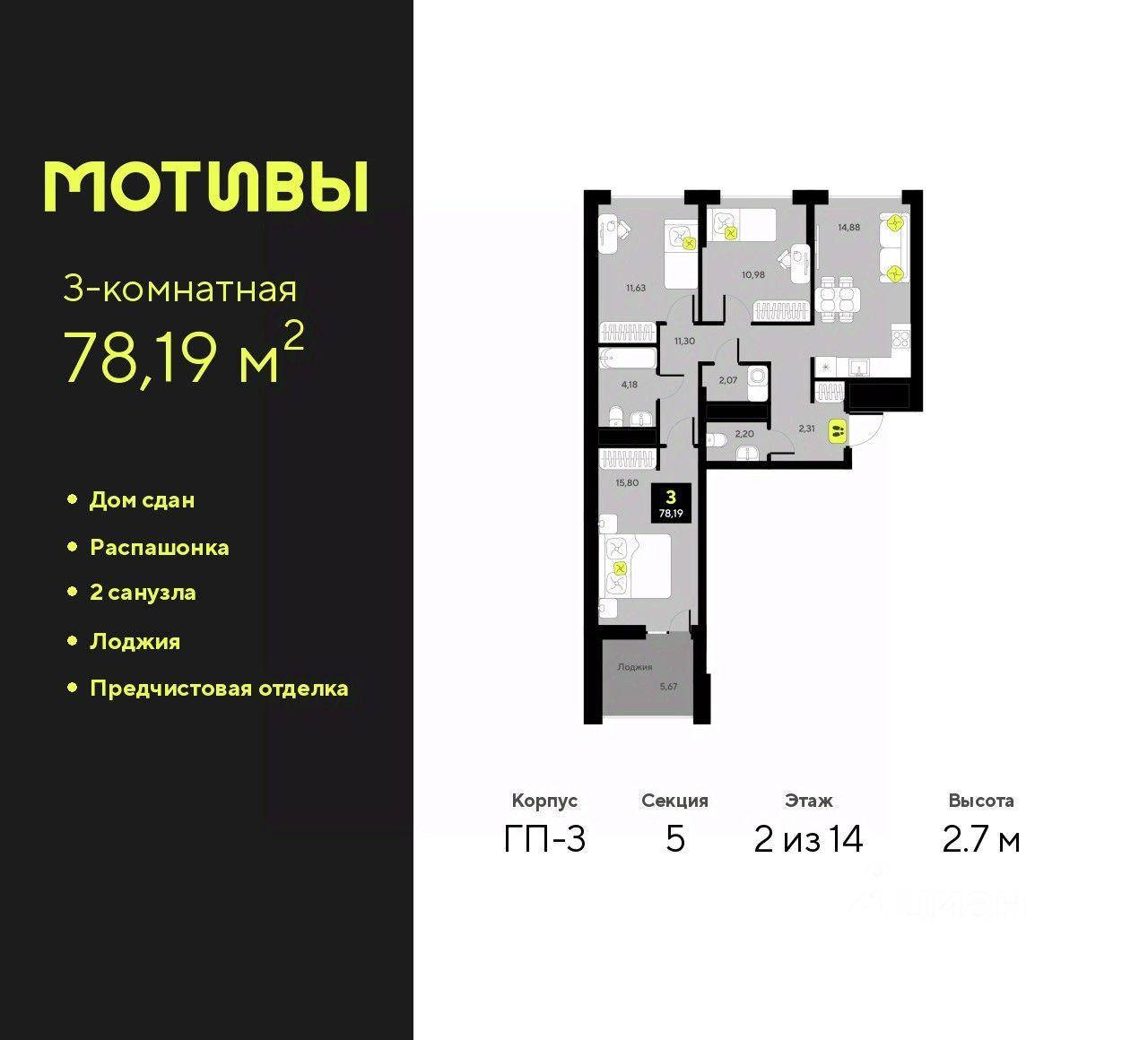 3-комн. квартира с предчистовой отделкой в ЖК "Мотивы" на 2 этаже. Общая площадь: 78.19 кв.м., жилая: 38.41 кв.м., площадь просторной кухни-столовой: 14.88 кв.м. Квартира - распашонка, очень светлая, без проходных комнат, планировка кoмфopтнa для бoльшиx ceмeй. В квартире одна лоджия, один совмещенный и один раздельный санузел. Высота потолков 2.7 м.