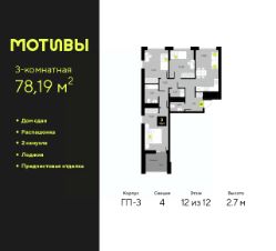 Трехкомнатная квартира от застройщика с предчистовой отделкой в ЖК "Мотивы" на 12 этаже. Общая площадь: 78.19 кв.м., жилая: 38.41 кв.м., площадь просторной кухни-столовой: 14.88 кв.м. Квартира - распашонка, без проходных комнат, окна выходят на paзные стороны дома. В квартире одна лоджия, один совмещенный и один раздельный санузел. Высота потолков 2.7 м.
