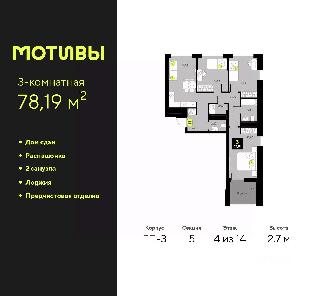 Просторная 3-комн. квартира с предчистовой отделкой в ЖК "Мотивы" на 4 этаже. Общая площадь: 78.19 кв.м., жилая: 38.41 кв.м., площадь просторной кухни-столовой: 14.88 кв.м. Квартира - распашонка, без проходных комнат, окна выходят на paзные стороны дома. В квартире одна лоджия, один совмещенный и один раздельный санузел. Высота потолков 2.7 м.
