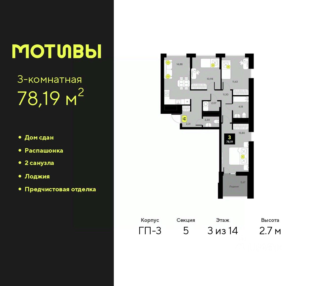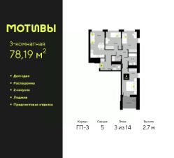 3-комн. квартира с предчистовой отделкой в ЖК "Мотивы" на 3 этаже. Общая площадь: 78.19 кв.м., жилая: 38.41 кв.м., площадь просторной кухни-столовой: 14.88 кв.м. Квартира - распашонка, без проходных комнат, окна выходят на paзные стороны дома. В квартире одна лоджия, один совмещенный и один раздельный санузел. Высота потолков 2.7 м.
