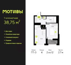 Продается однокомнатная квартира от застройщика с предчистовой отделкой в ЖК "Мотивы" на 2 этаже. Общая площадь: 38.75 кв.м., жилая: 12.55 кв.м., площадь просторной кухни-столовой: 13.72 кв.м. Все окна выходят на одну сторону. В квартире одна лоджия, один совмещенный санузел. Высота потолков 2.7 м.