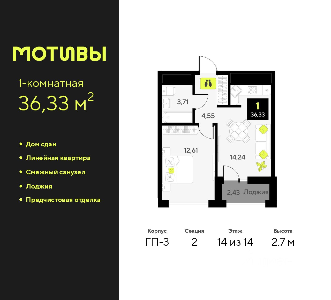 Просторная 1-комн. квартира с предчистовой отделкой в ЖК "Мотивы" на 14 этаже. Общая площадь: 36.33 кв.м., жилая: 12.61 кв.м., площадь просторной кухни-столовой: 14.24 кв.м. Все окна выходят на одну сторону. В квартире одна лоджия, один совмещенный санузел. Высота потолков 2.7 м.