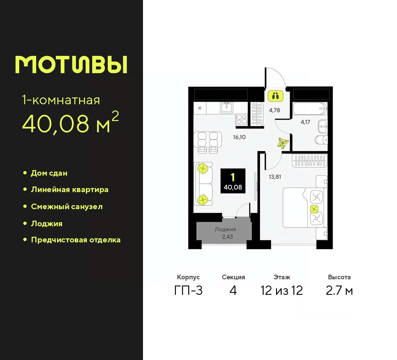 Продается однокомнатная квартира от застройщика с предчистовой отделкой в ЖК "Мотивы" на 12 этаже. Общая площадь: 40.08 кв.м., жилая: 13.81 кв.м., площадь просторной кухни-столовой: 16.1 кв.м. Все окна выходят на одну сторону. В квартире одна лоджия, один совмещенный санузел. Высота потолков 2.7 м.