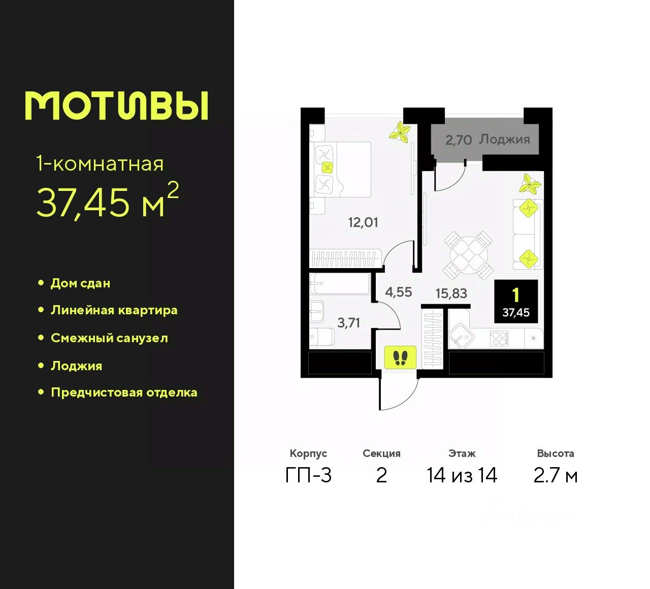 Продается однокомнатная квартира с предчистовой отделкой в ЖК "Мотивы" на 14 этаже. Общая площадь: 37.45 кв.м., жилая: 12.01 кв.м., площадь просторной кухни-столовой: 15.83 кв.м. Все окна выходят на одну сторону. В квартире одна лоджия, один совмещенный санузел. Высота потолков 2.7 м.