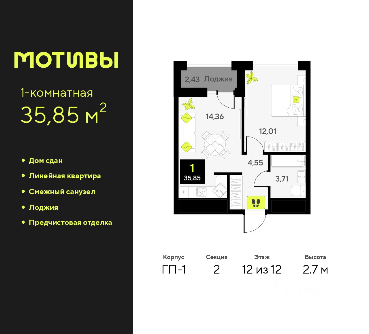 Продается однокомнатная квартира от застройщика с предчистовой отделкой в ЖК "Мотивы" на 12 этаже. Общая площадь: 35.85 кв.м., жилая: 12.01 кв.м., площадь просторной кухни-столовой: 14.36 кв.м. Все окна выходят на одну сторону. В квартире одна лоджия, один совмещенный санузел. Высота потолков 2.7 м.