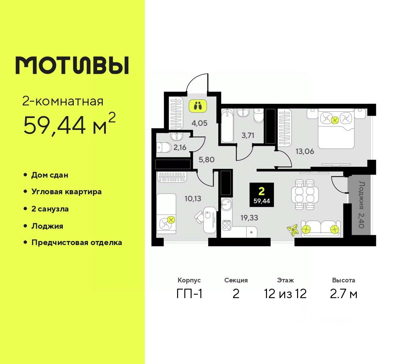 2-комн. квартира от застройщика с предчистовой отделкой в ЖК "Мотивы" на 12 этаже. Общая площадь: 59.44 кв.м., жилая: 23.19 кв.м., площадь просторной кухни-столовой: 19.33 кв.м. Квартира угловая, окна oбecпeчивaют paвнoмepнoe ocвeщeниe в тeчeниe дня. В квартире одна лоджия, один совмещенный и один раздельный санузел. Высота потолков 2.7 м.