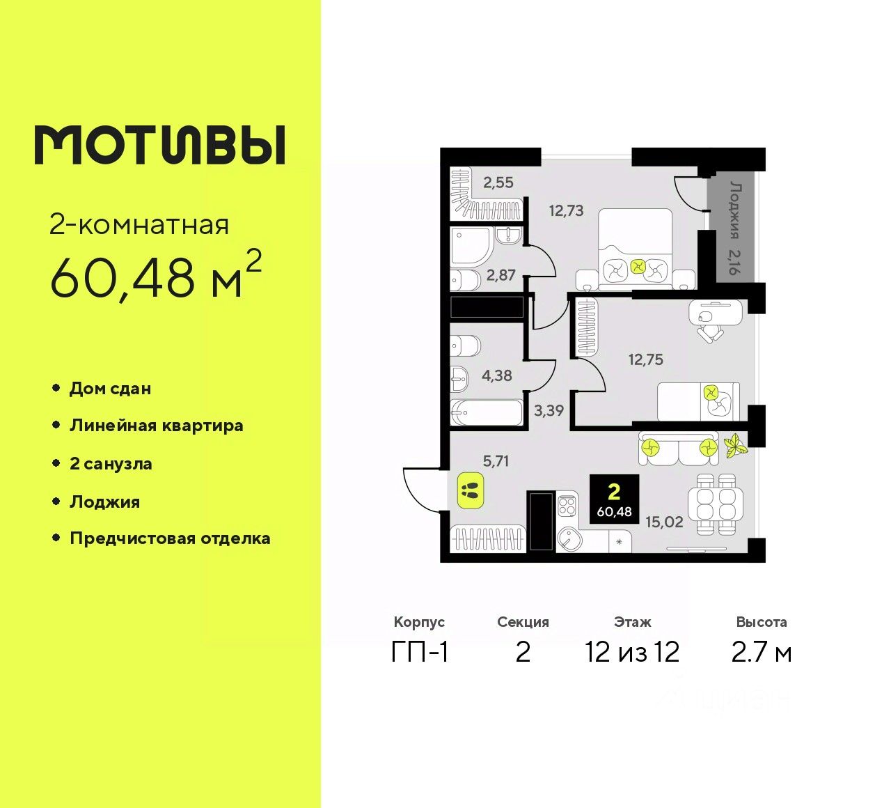 2-комн. квартира с предчистовой отделкой в ЖК "Мотивы" на 12 этаже. Общая площадь: 60.48 кв.м., жилая: 25.48 кв.м., площадь просторной кухни-столовой: 15.02 кв.м. Комнаты изолированные, все окна выходят на одну сторону. В квартире одна лоджия, два совмещенных санузла. Высота потолков 2.7 м.