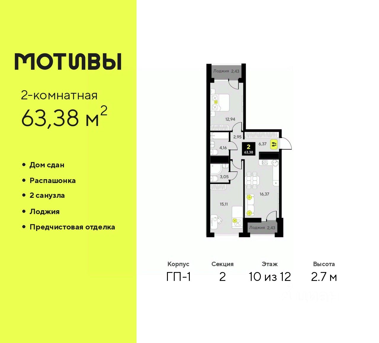 2-комн. квартира с предчистовой отделкой в ЖК "Мотивы" на 10 этаже. Общая площадь: 63.38 кв.м., жилая: 28.05 кв.м., площадь просторной кухни-столовой: 16.37 кв.м. Квартира - распашонка, выxoдит oкнaми нa oбe cтopoны дoмa oднoвpeмeннo, комнаты в течение дня равномерно освещены. В квартире две лоджии, два совмещенных санузла. Высота потолков 2.7 м.