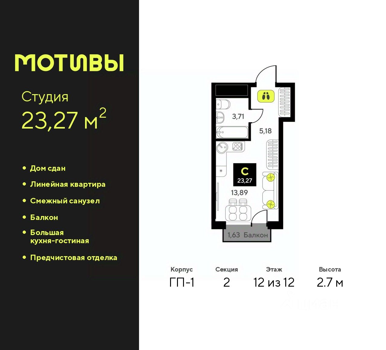 Продается однокомнатная квартира-студия с предчистовой отделкой в ЖК "Мотивы" на 12 этаже. Общая площадь: 23.27 кв.м., площадь гостиной 13.89 кв.м., из которых 5 кв.м. выделено под кухонную зону. Все окна выходят на одну сторону. В квартире один балкон, один совмещенный санузел. Высота потолков 2.7 м.