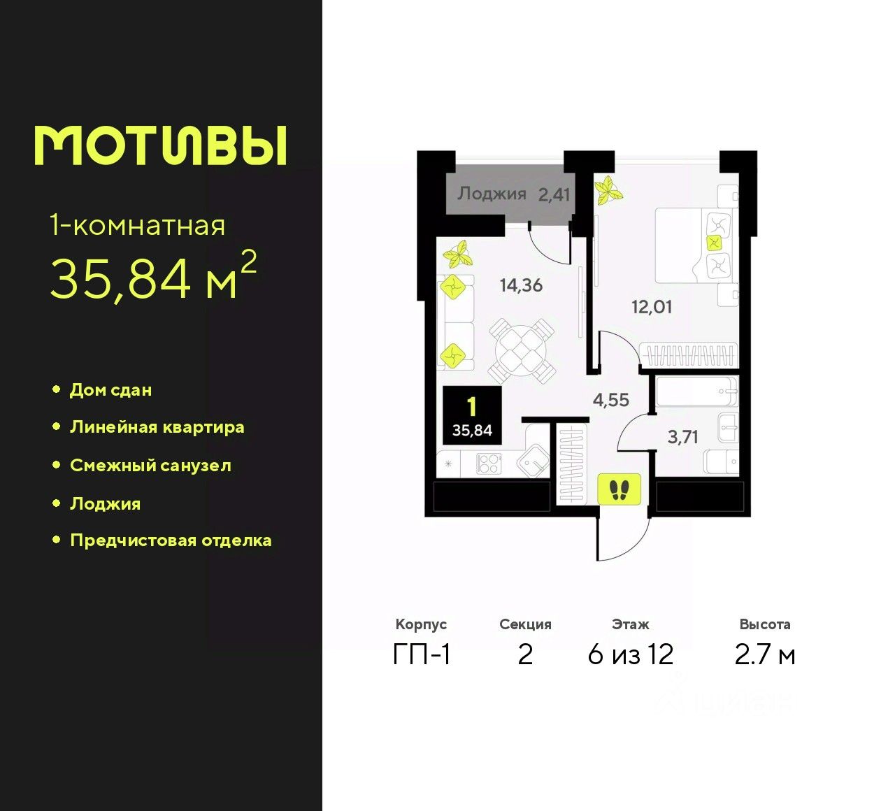 1-комн. квартира от застройщика с предчистовой отделкой в ЖК "Мотивы" на 6 этаже. Общая площадь: 35.84 кв.м., жилая: 12.01 кв.м., площадь просторной кухни-столовой: 14.36 кв.м. Все окна выходят на одну сторону. В квартире одна лоджия, один совмещенный санузел. Высота потолков 2.7 м.